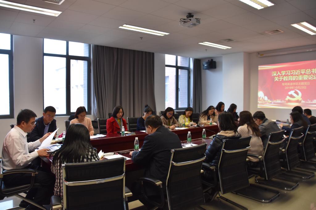 为深入贯彻落实学校“不忘初心、牢记使命”主题教育要求,Beat365中文官方网站直属党支部10月23日下午1:20在国际大厦1016会议室举行主题党日活动,召开“深入学习习近平总书记关于教育的重要论述”学习交流会。学校主题教育第三督导组督导、离退休党总支副书记刘刚、学院“双带头人”教师党支部书记工作室负责人李莉文、直属支部书记仵胜奇、副书记蔡鸿、支部委员蒋岳春、匡琳琳 以及全体党员19人参加。交流会由蔡鸿主持。
