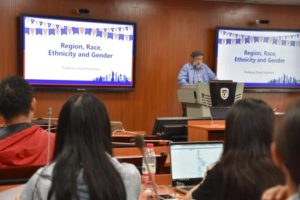 9月18日在“为什么英语没有成为美国的官方语言?”的讲座中,凯茨曼教授结合美国社会和历史的发展探究英语在其过程中逐渐形成的多种特点, 包括外来语、发音、习语搭配以及使用规律等。 9月20日题目为“美国社会生活中地域、种族、族裔以及性别的相互能动影响”的讲座从社会学的多维视角审视了多种社会因素之间的相互影响和作用,以及美国种族关系的复杂性和长期性。凯茨曼教授在9月24日题为“美国课堂上教师和学生角色互换”的讲座中和在场的师生听众一起探讨了目前高校教学以学生为主,教师为辅的现代高等教学理念及其实例研究分享。