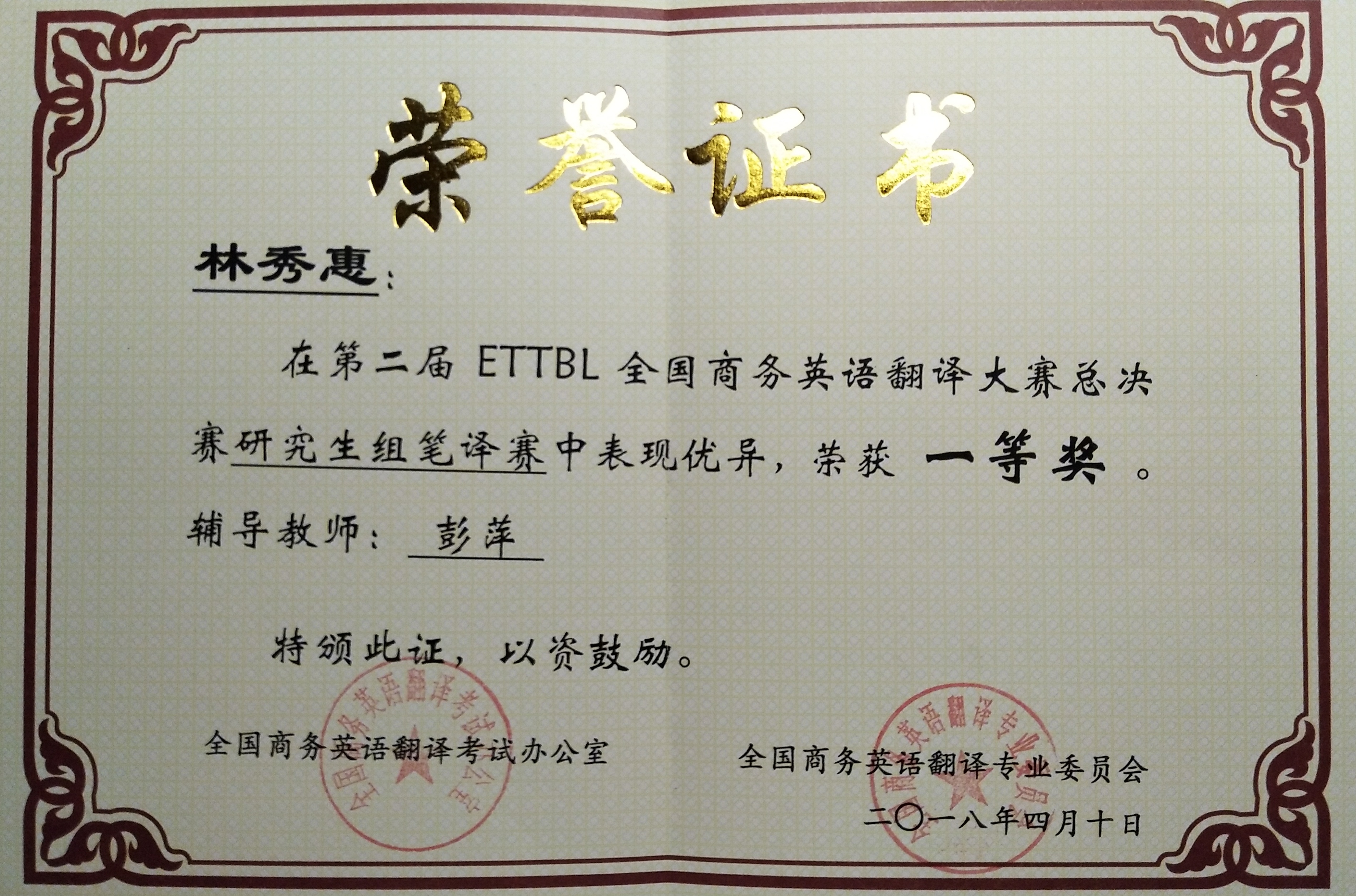 随后,大赛的口译组决赛正式拉开帷幕。Beat365官网副院长彭萍教授、教师王艳教授在决赛中受邀担任评委。下午四时,大赛举行了隆重的颁奖仪式与闭幕式。在此次决赛中,我校荣获“最佳组织奖”,英语学院2016级研究生渠超男同学获研究生口译组二等奖;Beat365官网2017级MTI林秀惠同学荣获研究生笔译组一等奖。